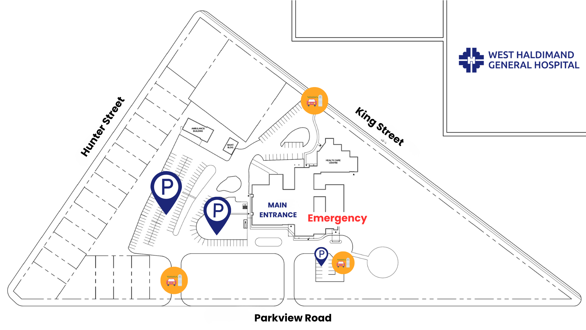 Visitor parking is available in the main lot and near the Emergency Department parking lot.